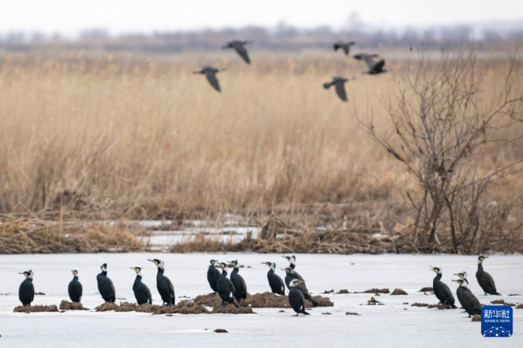 这是4月1日拍摄的兴凯湖国家级自然保护区内的普通鸬鹚。
