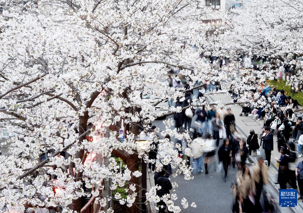 近日,日本东京迎来樱花季,目黑川畔樱花盛开,引游人参观游览。