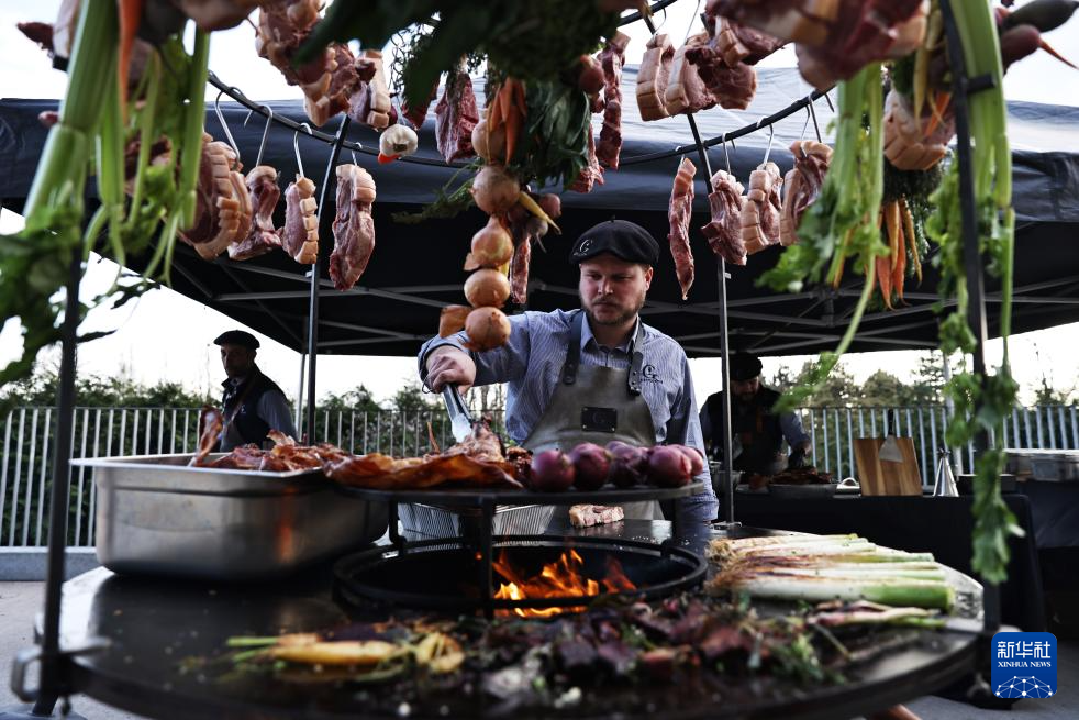 3月30日,在法国大东部大区摩泽尔省的梅斯市,工作人员烤制乳猪和蔬菜。