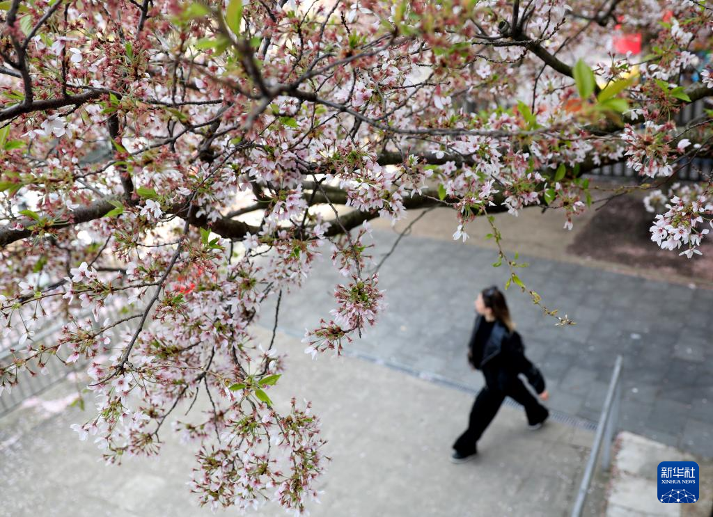 4月1日,在英国首都伦敦,一名女子走在樱花树下。