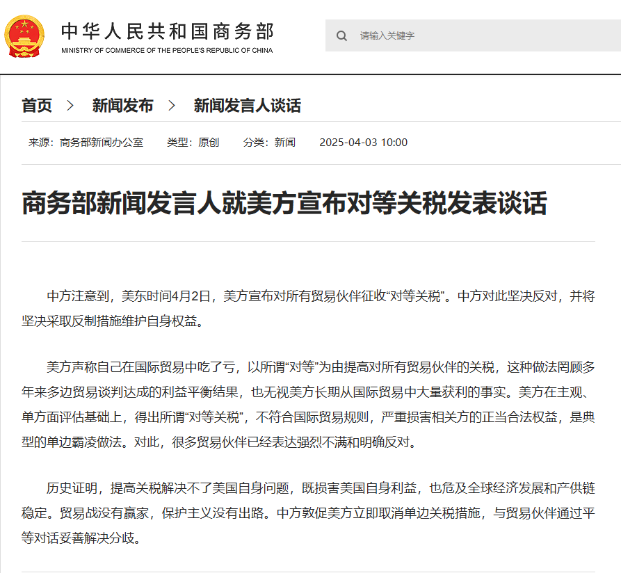 商务部新闻发言人就美方宣布对等关税发表谈话