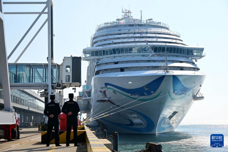 “爱达·魔都号”邮轮靠泊在青岛邮轮母港码头(4月6日摄)。