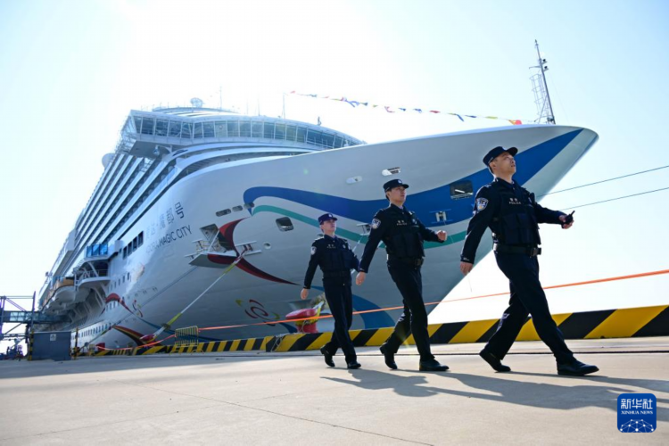 4月6日,在青岛邮轮母港码头,几名出入境边防检查站警官从“爱达·魔都号”邮轮旁经过。