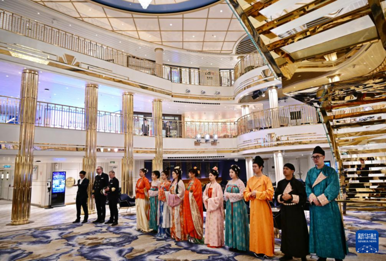 4月6日,“爱达·魔都号”邮轮上的工作人员在大厅迎客。
