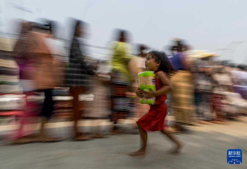 4月4日,在缅甸曼德勒皇宫附近的一处安置点,一名儿童领取食物。