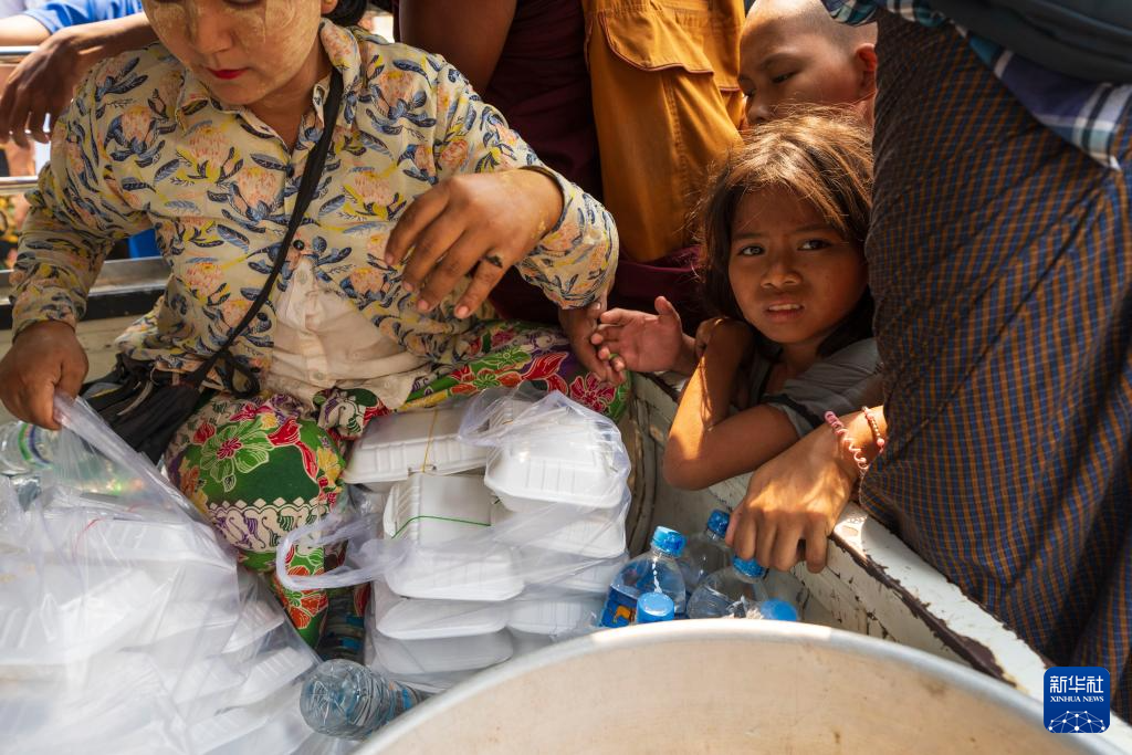 4月4日,在缅甸曼德勒皇宫附近的一处安置点,一名儿童等待领取食物。