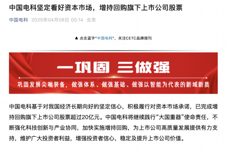 记者4月8日从中国电子科技集团有限公司获悉,中国电科坚定看好资本市场,增持回购旗下上市公司股票。中国电科基于对我国经济长期向好的坚定信心,积极履行对资本市场承诺,已完成增持回购旗下上市公司股票超过20亿元。中国电科将继续践行“大国重器”使命责任,不断强化科技创新与产业协同,加快实施增持回购,为上市公司高质量发展提供有力支持,维护广大投资者利益,增强投资者信心,稳定及提升上市公司价值。(记者温竞华)