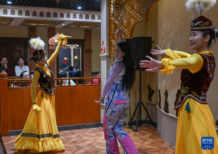 这是在除夕夜,一名游客(中)在新疆阿勒泰一家餐厅与工作人员共舞(2025年1月28日摄)。
