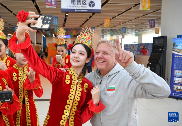 这是在新疆天山天池国际滑雪场雪具大厅,参加2025年中国国际雪地排球邀请赛的保加利亚男队教练员(右)和参与文艺表演的中学生木妮拉·艾买提合影(2025年2月23日摄)。