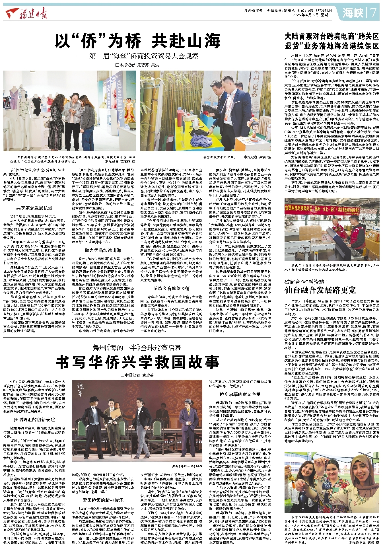 舞剧《海的一半》剧照 4月6日晚,舞剧《海的一半》在泉州大剧院拉开全球巡演的序幕。这部以“华侨旗帜、民族光辉”陈嘉庚先生为原型创作的舞蹈作品,通过现代舞蹈语言与闽南文化符号的碰撞,演绎百年华侨奋斗史与家国情怀,构建了一场跨越山海的艺术对话,以艺术为笔勾勒南洋游子的集体肖像,讲述以教育振兴民族的壮阔篇章。 舞蹈语汇的创新表达 随着海涛声袭来,海浪的光影在舞台布景上翻涌,《海的一半》的故事由此徐徐拉开。 剧目以“倾资兴学”为切入点,构建了跨越南洋与闽南两地的叙事框架,并通过高度象征性的舞台设计与肢体语言,再现了陈嘉庚先生艰苦创业、心系祖国、倾资兴学的光辉历程。 舞台上,舞者身穿西服、头戴礼帽、手持手杖,以复古范的打扮亮相,群舞时气势磅礴,独舞时轻盈飘逸,极具感染力和视觉冲击力。 该剧编排运用了大量刚劲有力的舞蹈语汇,结合现代舞的流畅多变,呈现出华侨群体的刚毅果敢。同时,以现代感的舞美设计丰富了“海”的意向,带有闽南韵味和南洋风情的民居、渔船、海港,将现场观众带入海滨侨乡的氛围。 此外,以16块巨大吊板组成灵活变化的舞台背景,时而映照成一片温柔的霞光,时而化作简约的渔船,时而旋转拼接成巨型会议桌,从而产生相对应的空间暗示,譬如南洋会议室、海上舢板、开学典礼等场幕,以及海浪、甲板等多重形象,也成为贯穿全剧“漂泊感”的具象载体。 “这样的舞台设计,既展现出隔离感,同时也将不同场景、不同地域整合在这个极具表现力的空间结构之中,增强了视觉体验。”《海的一半》编导刘丁睿介绍。 看完演出的观众许毅辰连连点赞:“以舞剧的形式演绎陈嘉庚先生兴学救国的事迹,演绎形式很新颖,编排设计很巧妙,场面也很震撼,值得一看。” 爱国侨领的精神传承 《海的一半》是一部承载着深厚历史与文化底蕴的原创大型舞剧,它的诞生源于对陈嘉庚先生卓越贡献的深切缅怀与敬仰。 陈嘉庚先生是享誉海内外的侨界领袖,他为教育事业发展和民族振兴作出了不朽贡献,被誉为“华侨旗帜、民族光辉”,他的实践和精神形成了独特而丰富的“嘉庚精神”。 百年前,无数像陈嘉庚先生一样的侨胞,以“敢为天下先”的魄力远渡重洋,在异乡开疆拓土,却始终心系故土。舞剧《海的一半》除了陈嘉庚先生,也塑造了一批民国时期的海外华侨群像,再现了历史上独特的海外侨胞创业者群体。 剧中,“海庚”与“海贤”兄弟的命运交织,正是华侨群体“身居海外、心系家国”的真实写照——他们以血汗浇铸理想,以赤诚守护文化根脉,用行动诠释“教育为立国之本,兴学乃国民天职”的信念。 “《海的一半》是永不抛弃、永不放弃的选择。”在舞剧《海的一半》导演林辰看来,这不仅是一部关于漂泊与故乡的舞剧,更深情致敬了整个华侨群体在近代历史中所发挥的巨大作用。 中国东方演艺集团运营总监、东方歌舞团有限公司董事长张利说:“希望通过这部优秀舞台艺术作品,舞出中国人的精气神,将嘉庚先生及爱国华侨们的精神与情怀传递给每一位观众。” 侨乡启幕的意义考量 舞剧《海的一半》选择泉州这座“涨海声中万国商”的千年古城作为巡演的启幕,不仅是对陈嘉庚先生的致敬,更是新时代华侨精神的彰显。 从宋元时期刺桐港的万帆竞发,到近代闽南人“下南洋”的浪潮,泉州人的血脉中始终流淌着“闯海”的基因。泉州现有海外泉籍华侨华人1000多万人,占全国1/6、福建省一半以上,主要分布在世界170多个国家和地区,在全国设区市位居第一,是海外侨胞的“精神原乡”。 “泉州是祖父深情怀牵的热土,是他毕生奉献教育、播撒爱国火种的重要之地。他倡办泉州六中、支持晋江数十所学校、深入民间体察疾苦、率南侨慰劳团在泉州为民请命、走进校园勉励师生,他始终以行动践行‘爱国爱乡、敢为人先’的华侨精神。这片土地承载着他兴学救国的理想,也见证了他心系桑梓、胸怀家国的赤子之情。”陈嘉庚长孙、亚洲影响力董事局名誉主席陈立人表示。 在陈立人看来,舞剧《海的一半》在泉州开启全球巡演,既是对华侨精神的致敬,亦是对新时代使命的呼应。“希望这部作品能让更多同胞尤其是年轻一代感受到‘教育立国’的力量,并以此为纽带,凝聚起共筑中国梦的磅礴力量。” 舞剧《海的一半》将以泉州为起点,前往福州、厦门、北京、上海、广州等城市演出,并计划在将来开展国际巡演。“以《海的一半》巡演为契机,我们将与全球侨社携手,推动华侨精神成为世界读懂中国的文化符号,在海外讲好中国故事、华侨故事。”福建省侨联副主席,泉州市侨联党组书记、主席温锦辉表示。(福建日报记者 黄琼芬)