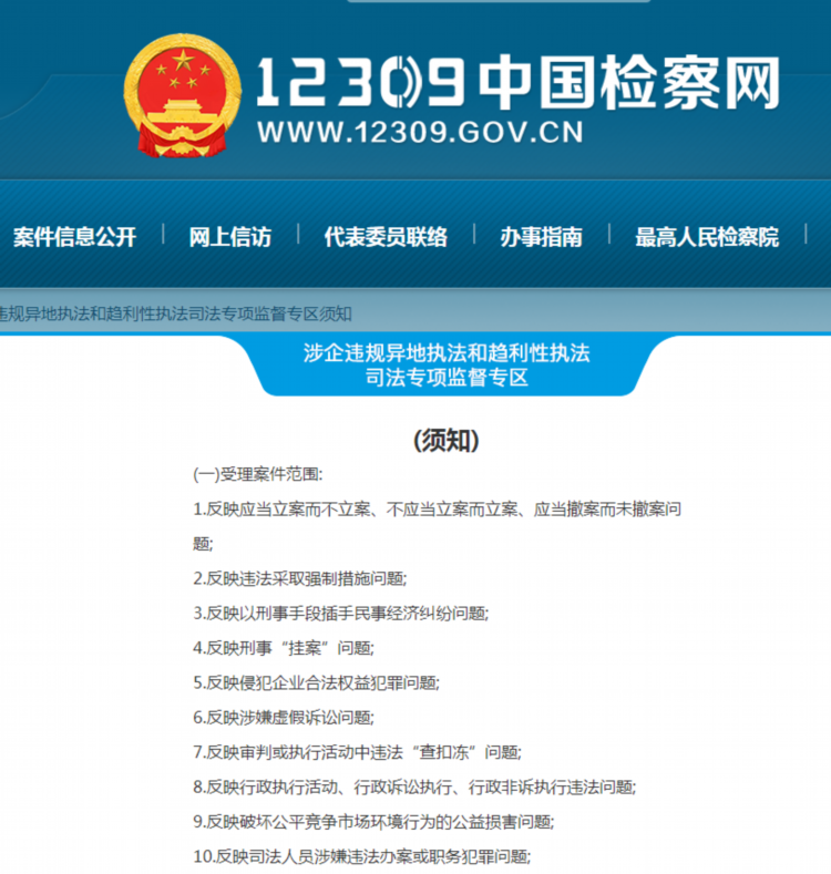 记者4月8日从最高人民检察院获悉,为畅通诉求表达渠道,依法平等保护各类经营主体合法权益,最高检在12309中国检察网设立了“涉企违规异地执法和趋利性执法司法专项监督专区”,受理有关控告线索。