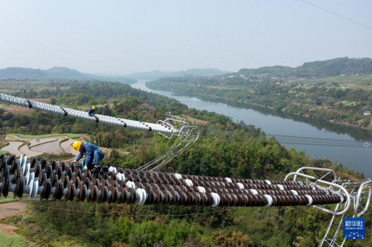 4月8日,在重庆市合川区,国网重庆超高压公司工作人员对“疆电入渝”特高压工程重庆段进行走线验收(无人机照片)。