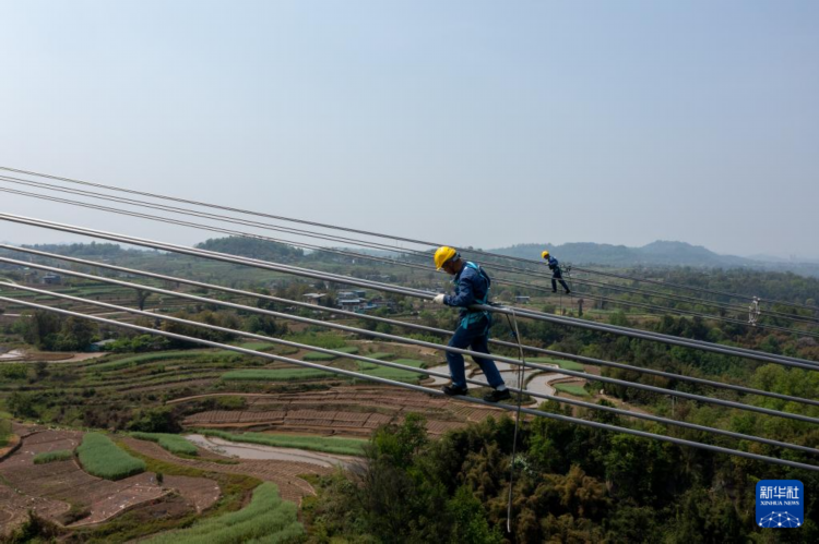 4月8日,在重庆市合川区,国网重庆超高压公司工作人员对“疆电入渝”特高压工程重庆段进行走线验收。