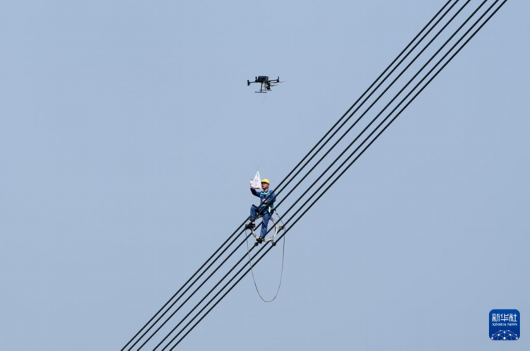 4月8日,在重庆市合川区“疆电入渝”特高压工程重庆段走线验收现场,国网重庆超高压公司地面工作人员利用无人机将矿泉水送给线路验收人员。