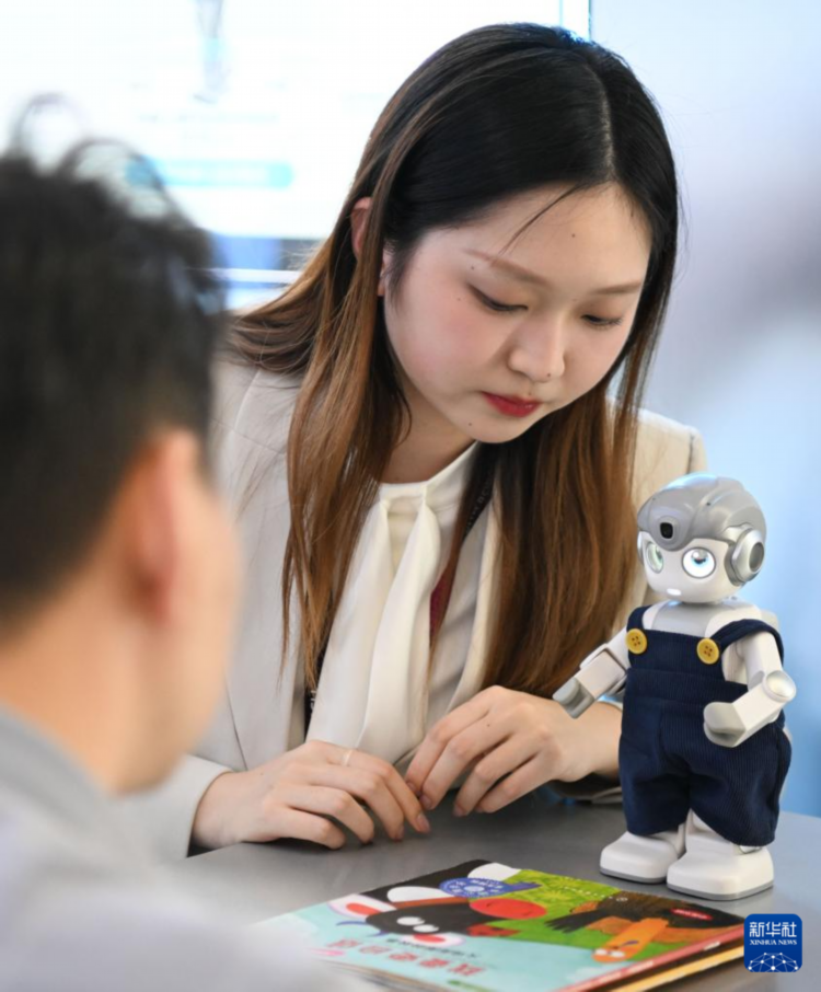 3月26日,在深圳优必选科技股份有限公司展厅,工作人员在和便携式智能机器人对话。