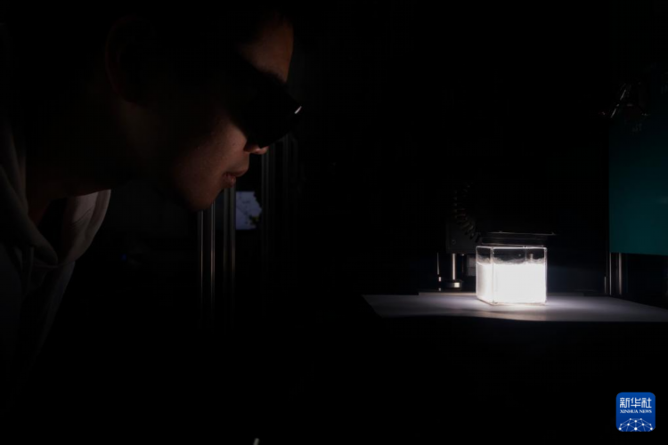 4月3日,在中国科学院金属研究所沈阳材料科学国家研究中心实验室,科研人员在观察光催化分解水制氢的实验进展。