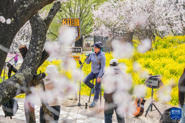 4月2日,游客在林芝市嘎拉村唱歌。