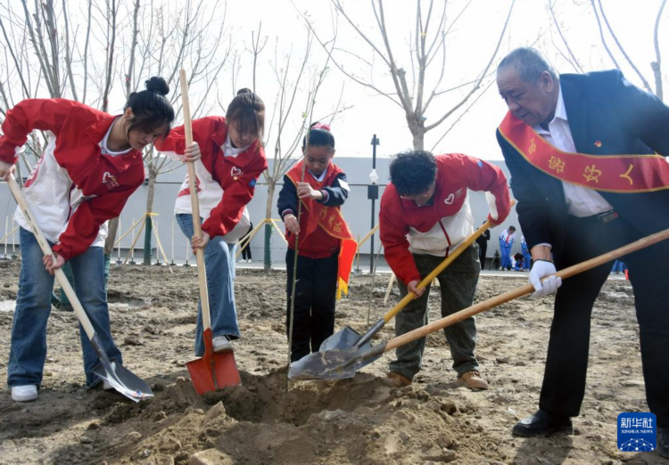 4月9日,在哈密市凤凰台大营,“哈密好人”代表、少先队员代表和西部计划大学生志愿者代表在种植“左公柳”。