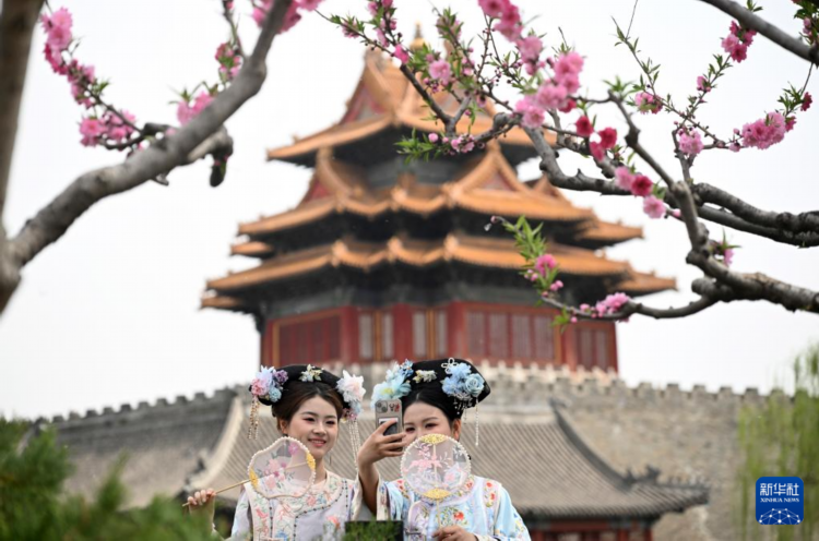 4月8日,两位相识于网上的学生在北京故宫角楼前自拍。她们分别来自河北和浙江,一起来北京游玩。