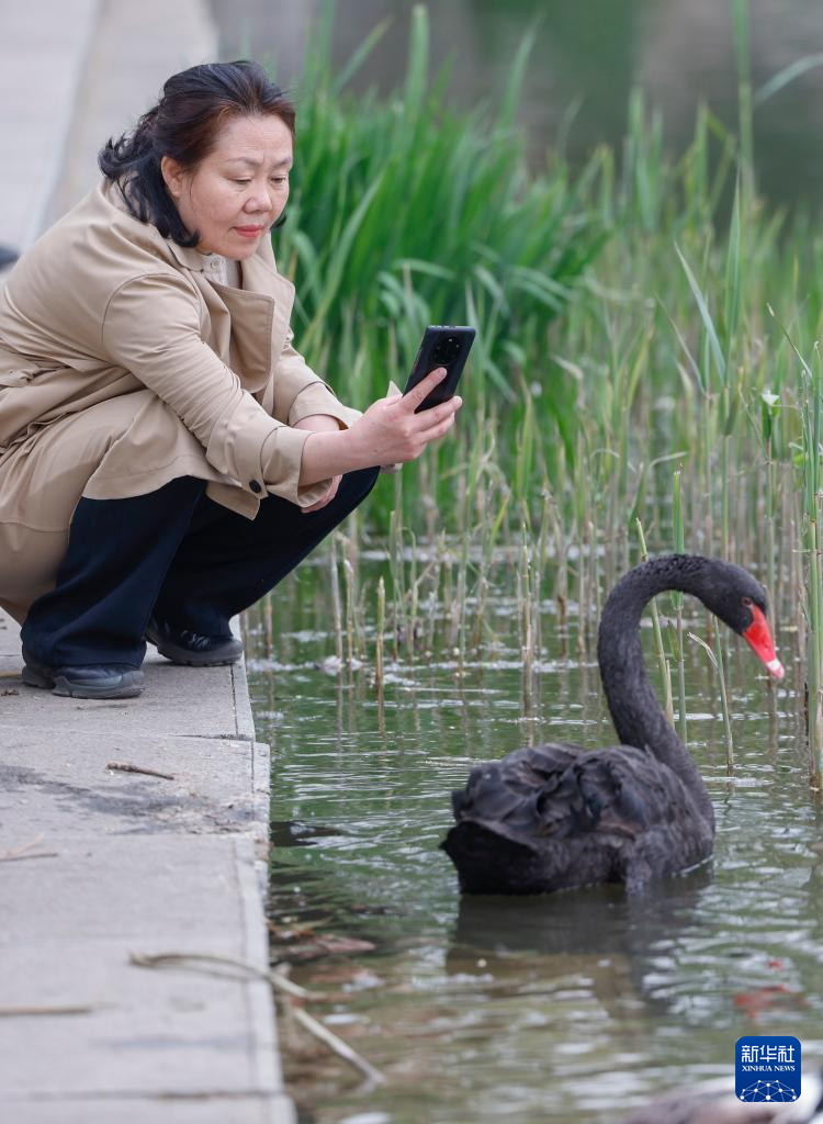 4月8日,一位游客在北京玉渊潭公园拍摄野生黑天鹅。
