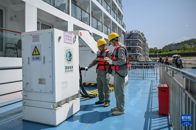 4月10日,国网宜昌供电公司岸电运维人员在湖北秭归港码头对岸电设备进行巡检。