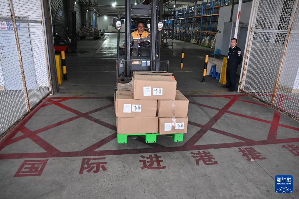 4月12日,福州长乐国际机场货运站工作人员将首票进口的印尼青椰货转运出仓。