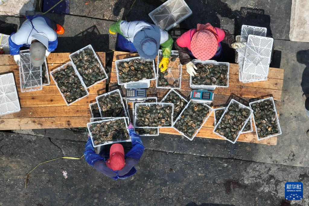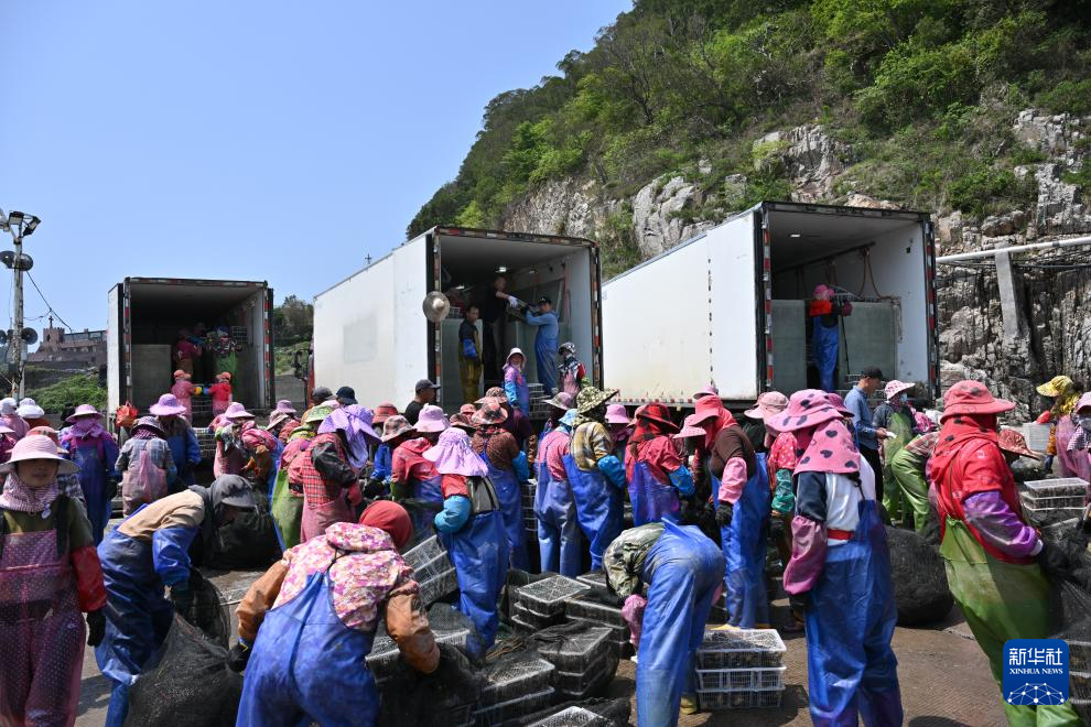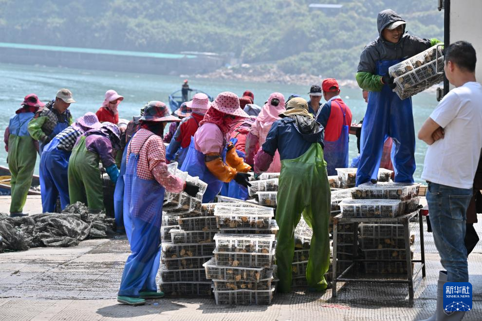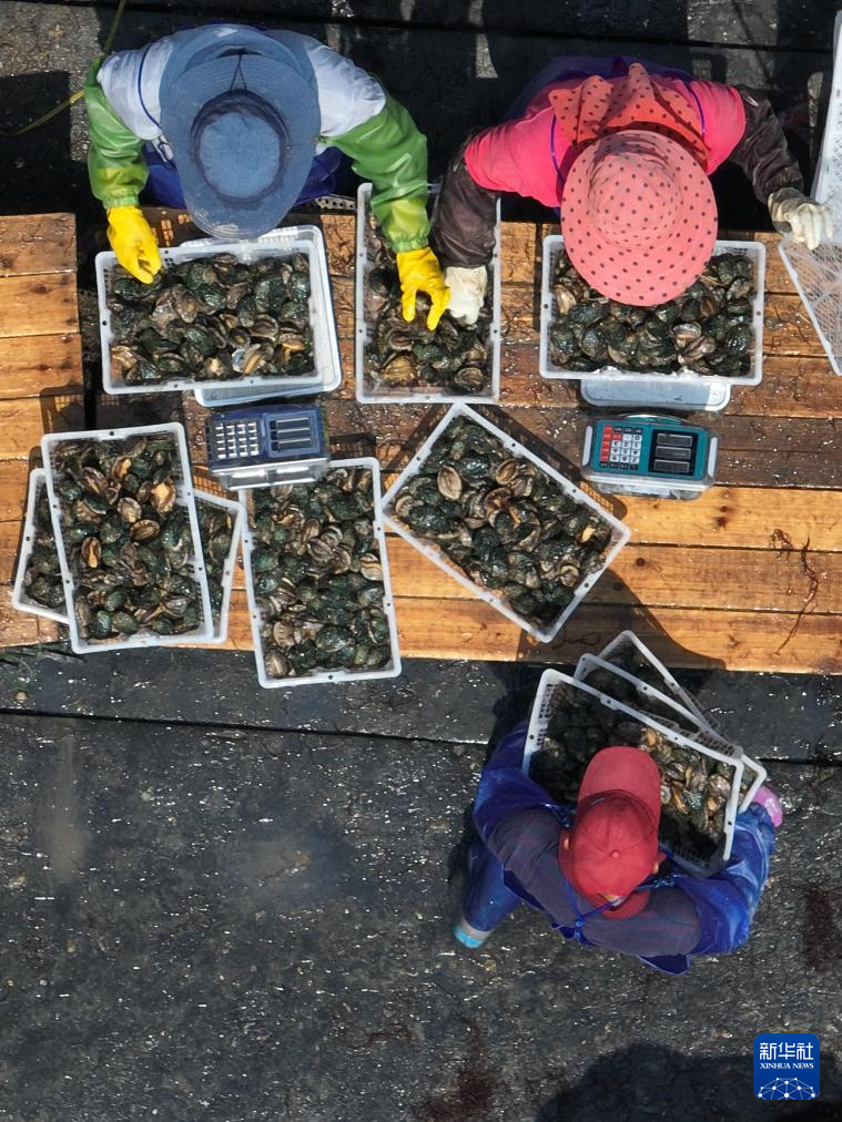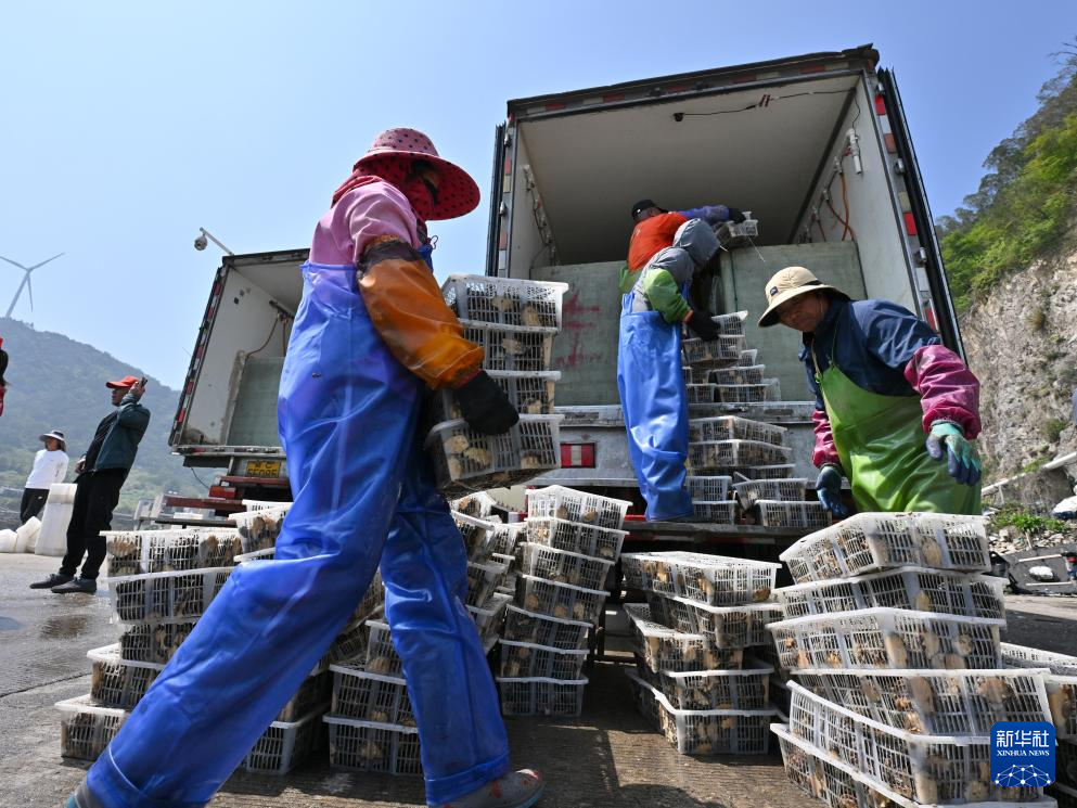 4月11日,在福建省福州市连江县黄岐半岛赤才村码头,渔民将收获的鲍鱼转运上车。