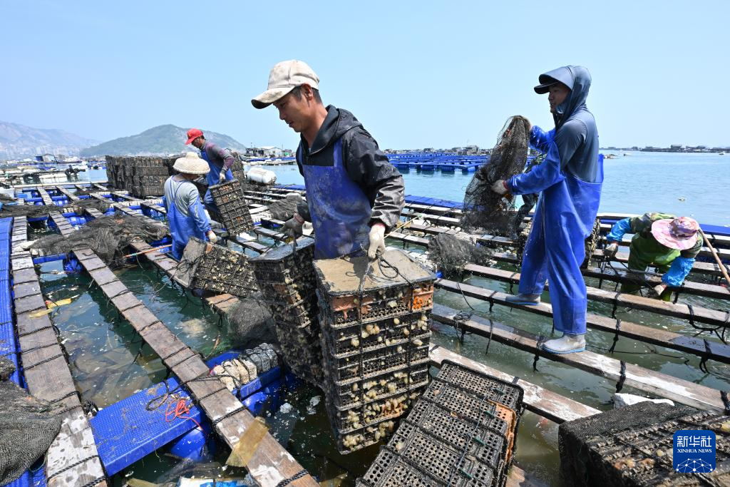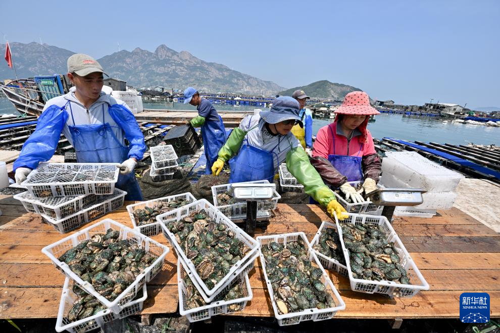 近日,在福建省福州市连江县黄岐半岛周边海域的渔排上,渔民们正热火朝天地收获鲍鱼,近5亿粒春鲍经过一年的成长收获上市。“中国鲍鱼之乡”连江县2024年鲍鱼养殖产量5.93万吨,位列全国县级第一,养殖面积1604公顷,产值约48.64亿元。