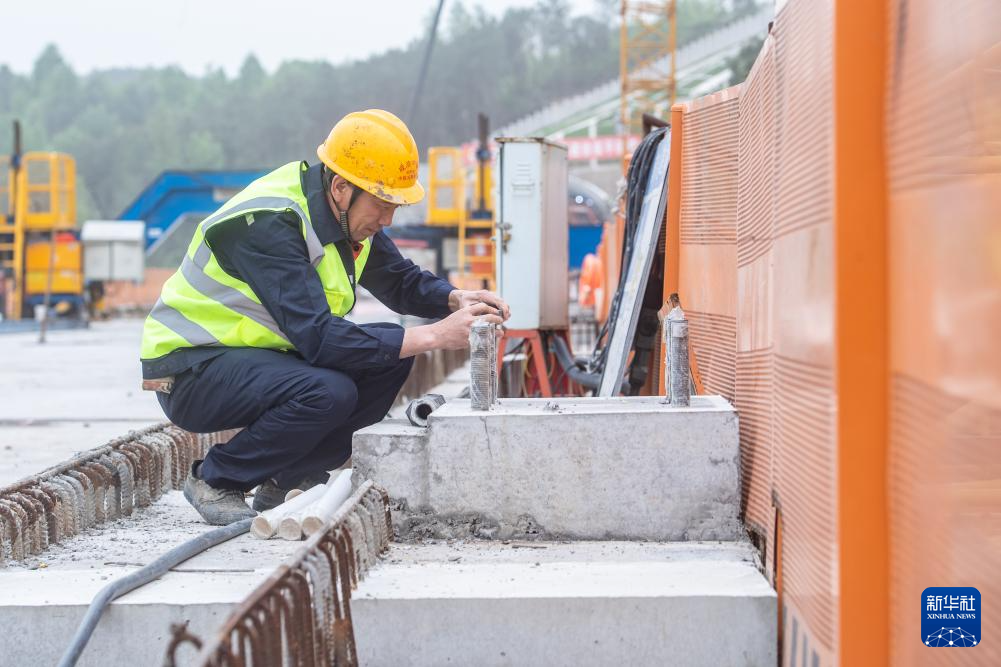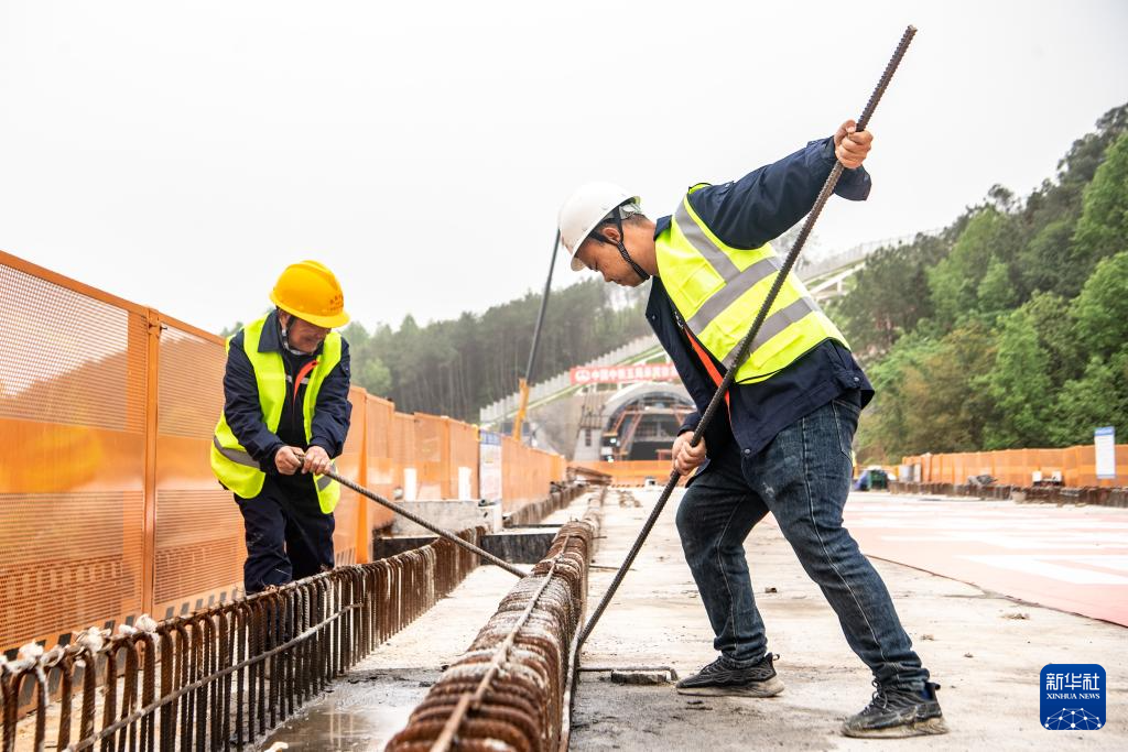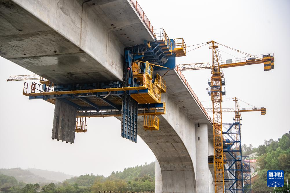 4月12日,工人在成渝中线高铁玄天湖双线大桥建设现场施工作业。