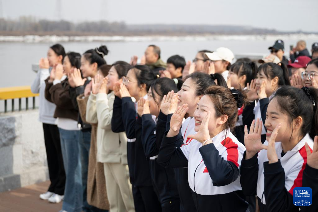 4月12日,人们在佳木斯市“喊江节”主会场高喊“开江啦”。