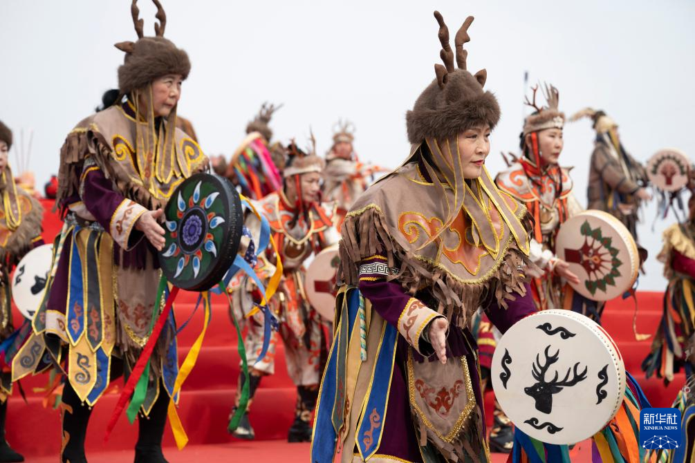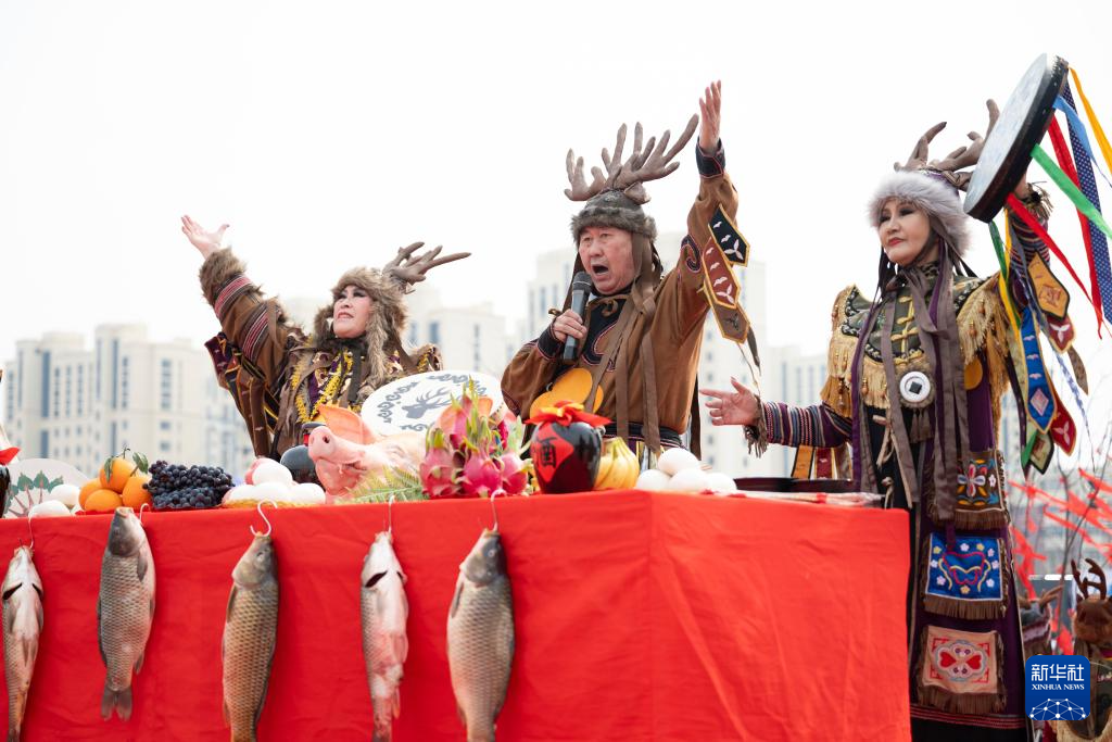 这是4月12日在佳木斯市“喊江节”主会场拍摄的赫哲族开江祈福仪式。
