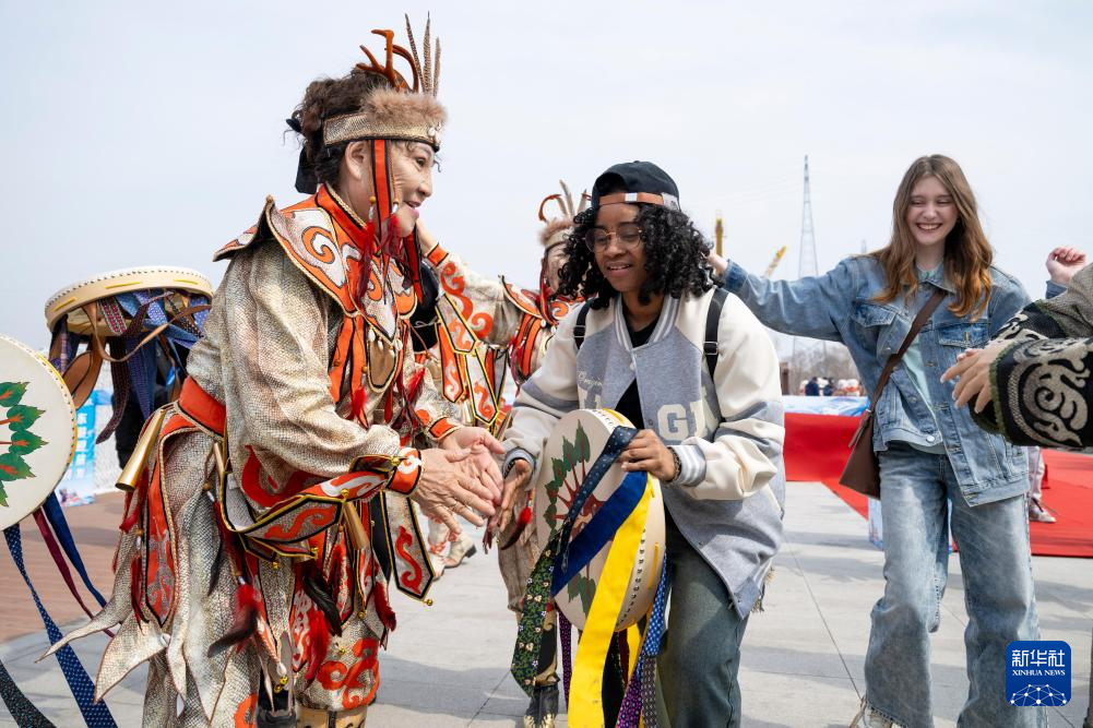 4月12日,在佳木斯市“喊江节”主会场,赫哲族演职人员与外国游客互动。