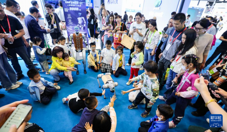 4月13日,在第五届消博会现场,小朋友和宇树科技展示的机器狗互动。
