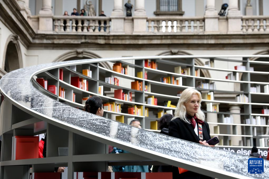 4月13日,在意大利米兰的布雷拉美术馆,人们观看2025米兰设计周展品《光之图书馆》。 2025米兰设计周4月7日至13日在意大利米兰举行。 新华社记者 李京 摄