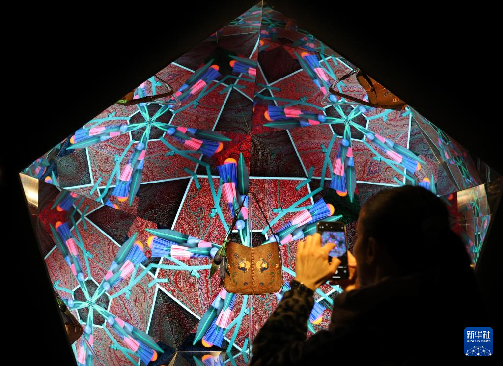 4月13日,在意大利米兰,一名参观者在2025米兰设计周上拍摄面料艺术作品。