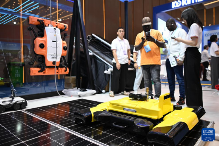 这是4月15日在第137届广交会服务机器人专区拍摄的光伏板清洁机器人和高空幕墙清洁机器人。