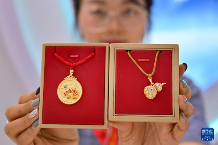 4月15日,消博会安徽馆的展商展示用花丝镶嵌、螺钿镶嵌等工艺技法制作的金饰。花丝镶嵌制作技艺是国家级非物质文化遗产。