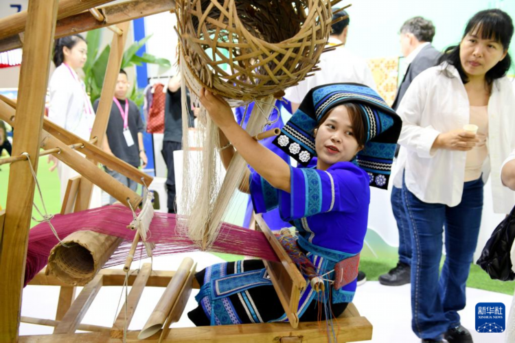 4月15日,工作人员在第五届消博会广西展台为参观者演示并介绍壮族织锦技艺。壮族织锦技艺是国家级非物质文化遗产。