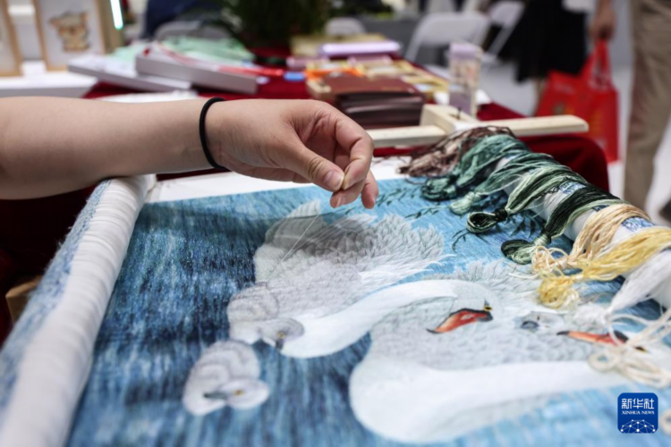 4月15日,参展商在消博会上制作湘绣。湘绣是国家级非物质文化遗产。