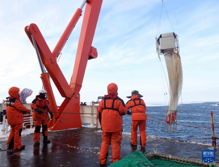 3月29日,科考队员在“雪龙2”号艉甲板进行浮游生物垂直网作业。