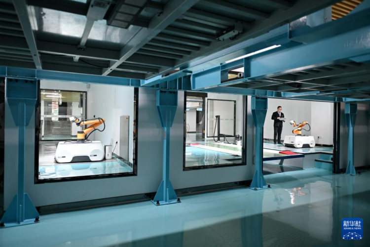 4月15日,在雄安新区剧村220千伏变电站智慧充电区,工作人员在调试插拔枪机器人。