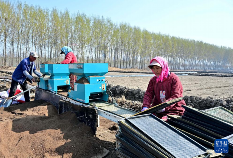4月15日,唐山市曹妃甸区第四农场的农民在使用机械设备往秧盘上撒稻谷种。