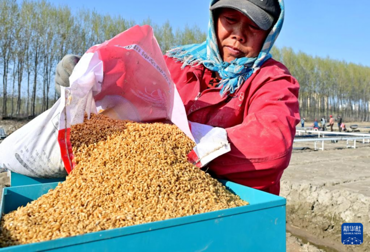 4月15日,唐山市曹妃甸区第四农场的农民将稻谷种子倒入育秧播种机。