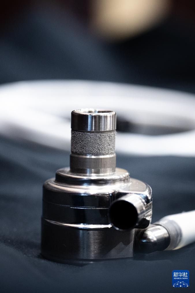 4月14日,医务人员展示儿童用磁悬浮双心室辅助装置。