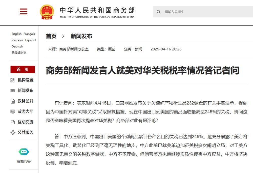 有记者问:美东时间4月15日,白宫网站发布关于关键矿产和衍生品232调查的有关事实清单,提到因为中国针对美“对等关税”采取报复措施,现在中国出口到美国的商品面临最高达245%的关税,请问这是否意味着美国再次提高对华关税?商务部对此有何评论?
