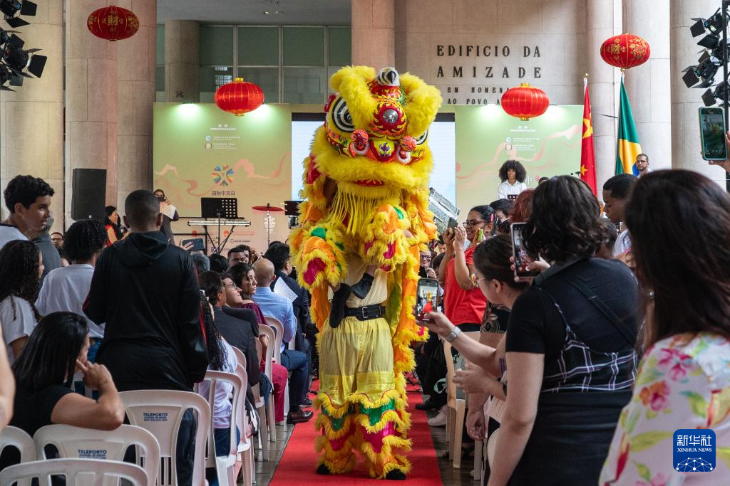 4月15日,在巴西里约热内卢天主教大学举办的“国际中文日”庆祝活动上,人们观看舞狮表演。