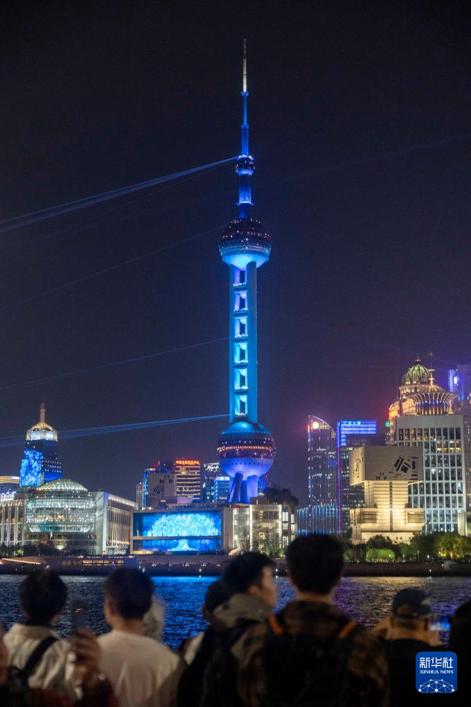 4月17日,人们在上海外滩拍摄对岸陆家嘴庆祝浦东开发开放35周年光影秀。