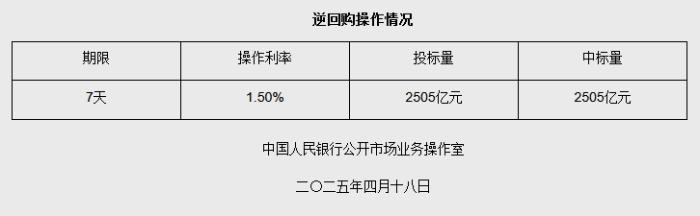 据央行网站消息,2025年4月18日中国人民银行以固定利率、数量招标方式开展了2505亿元逆回购操作。具体情况如下: