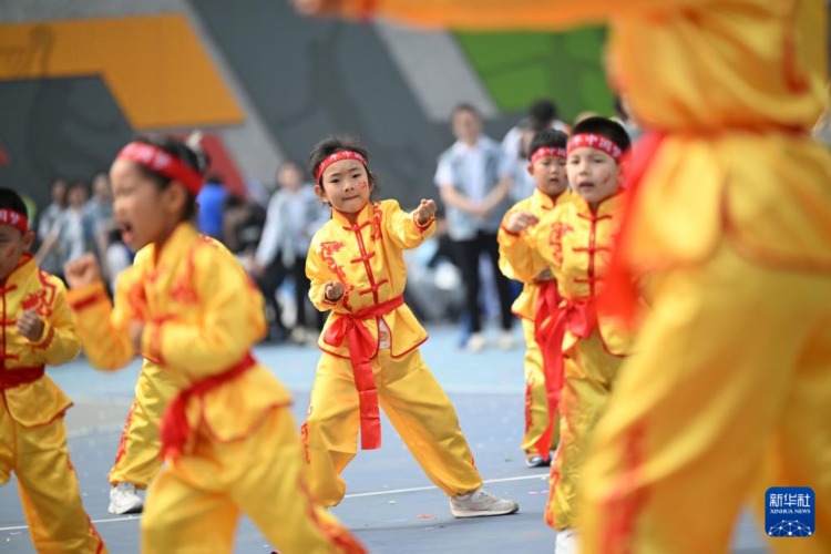 4月20日,孩子在亲子运动会上进行武术表演。