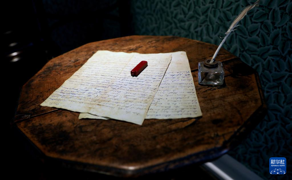 这是4月18日在英国汉普郡乔顿村的简·奥斯汀故居内拍摄的奥斯汀用于写作的桌子。